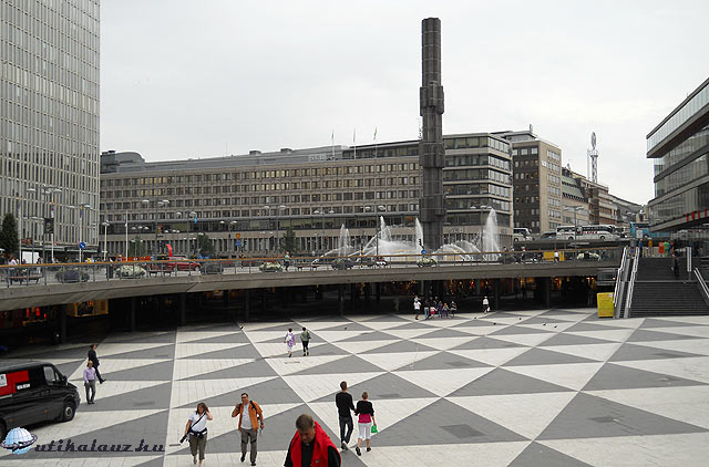 Városnézésünket sajnos már megint az eső nehezíti. Egész napra érvényes bérlettel szállunk fel a metrora, ami fél óra alatt a központba röpít. A földalatti érdekessége, hogy helyenként a felszínre bukkanva robog percekig, hogy aztán ismét a felszín alá bukjon. A városközpontban a Centralbron szállunk ki, itt van a közismert eliptikus formájú tér, a Sergelstorg, melynek közepén a 37 m magas, 1974-ben épült üvegoszlop, a Kristal Vertical Accent áll.