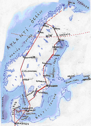 Hamburg Koppenhága Oslo Trondheim-fjord Északi-sarkkör Narvik Kiruna Botteni-öböl Stockholm