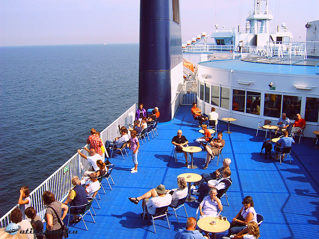 A Puttgarden melletti kempingben éjszakázunk. A fehér homokos, kavicsokkal borított széles strandtól nem messze sátorozunk. A víz felől hűvös szellő fujdogál, jól hallatszik a zavarosan hullámzó, sűrű algacsomókat lebegtető tenger morajlása. Reggel kocsisor fogadott a kompterminál előtt. Félórás araszolás és 35 euró kifizetése után bent vagyunk a komp gyomrában, ahol három sorban mintegy ötven kocsi sorakozik. Mi is felmegyünk a tágas fedélzetre, fotózgatva gyönyörködünk az erős napsütésben szikrázó nyílttengeri látványban.