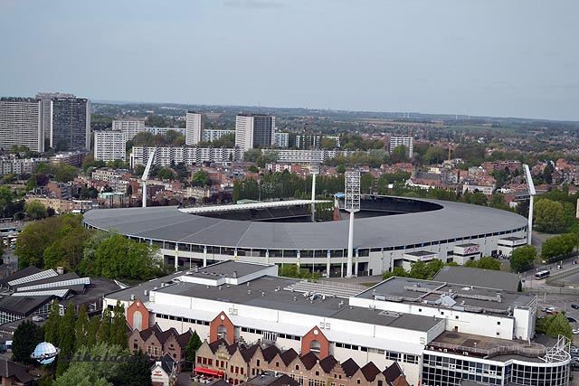 A rossz emlékű 1985-ös BEK döntőnek helyszínt adó Heysel stadion helyén felépített Baldvin király Stadion látképe az Atomiumból