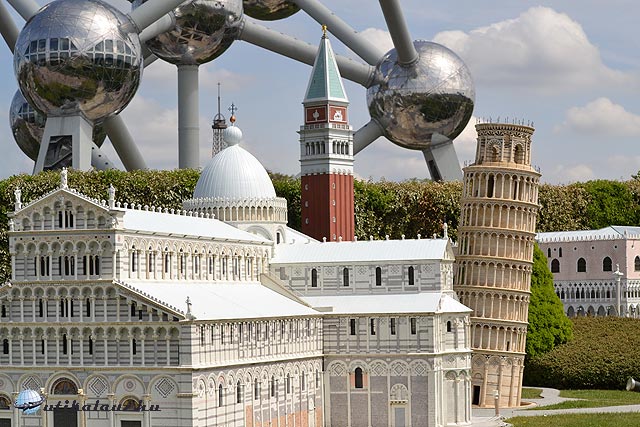 Egy kis Olaszország a Mini Európa parkban: Pisai dóm és ferde torony, mögötte a velencei St. Márk tér harangtornya, háttérben a Dózse palota