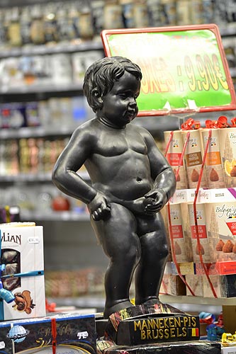 A téren és környékén hosszan lehet nézelődni, téblábolni és sodródni a turisták tömegével, szinte keresni sem kell, az ember egy idő után automatikusan a néhány utcára levő pisilő kisfiú (Manneken Pis) szobránál találja magát. Azt nem mondom, hogy egy lenyűgöző műalkotás lenne, sőt inkább jelentéktelennek tűnik, de a marketingje kétségkívül nagyon sikeres és szuvenírként a sörnyitótól kezdve a csoki figurákig minden elképzelhető formában megvásárolható. A párjának, az egy kis zsákutca végén rácsok mögé felállított (illetve felguggoltatott) Jeanneke Pis-nek koránt sincs ekkora ismertsége.