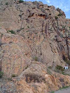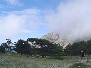 Tovább haladva 17,10-kor álltunk meg Col de Vergio hágónál, legmagasabb pontja 1464 m magasan fekszik, egy arctalan szoborral. Felhőkbe takarózó sziklák és hűvös idő fogadott bennünket. A közelben van a sziget legmagasabb csúcsa, a 2706 m magas Monte Cinto. Tovább mentünk a busszal, Calacuccia-nál rövid megállás fotózásra, majd következett a “Scala di Santa Regina”, vagyis a “Szent királynő lépcsője” szurdok, amely 8 km hosszan húzódik a műút két oldalán, hatalmas, néhol 500 m magas sziklafalakkal.