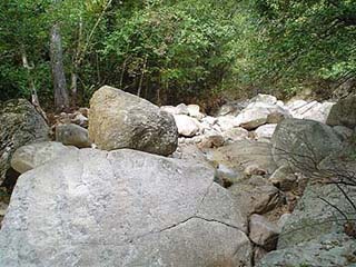 Az első állomásunk a Via Ferrata út volt 10 perces megállással (9,10-9,20). Néhány fénykép a patakról, kerek kövekről, sziklákról. A következő állomásunk Pont de Pucaraccia. Itt simára mosott sziklák között folyik patak, ennek medrében vezet a kapaszkodókkal teli út. Közülünk 12-en nekivágtak az útnak, kb. 2 óra alatt tették meg, néhányan vizesek lettek a bukdácsolásban. Mi nem mertünk nekivágni a kalandos útnak, csak a híd alatti néhány követ másztuk meg, majd egy kerülő lankás úton találkoztunk a sziklás mederrel. Negyven perccel az indulás után még hallani lehetett a többiek hangját. Néhány kis bokros növényt mentettünk át a tasakunkba, hátra tettük a busz végébe, haza is hoztuk. Pár szem gesztenyét is találtam az egyik fa alatt. A társak közül 4-en visszatértek fél 12 körül, ők egy tóhoz érve visszafordultak. A többiek 12 óra után érkeztek a lankás úton kifáradva, vizesen, de vidáman, lelkesen, élményekkel teli.