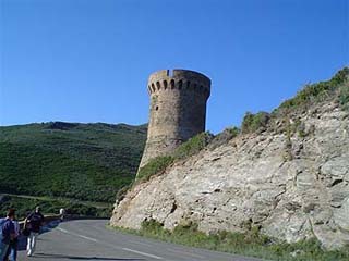 Áthaladtunk Bastia városon, majd végig a tengerparton. Először Erbalunga településnél álltunk meg fél órára, 8-45-től 9,15-ig. Lementünk a partra is a zegzugos utcákon, láttunk egy romos állapotú genovai őrtornyot. Vásároltunk képeslapot, majd indultunk tovább. 9,30-kor értünk Korzika legjobb állapotú őrtornyához (Tour de L’Osse). Ez a műút mellett áll balra, jobbra a meredek tengerpart. Itt készült egy csoportkép a résztvevőkkel.