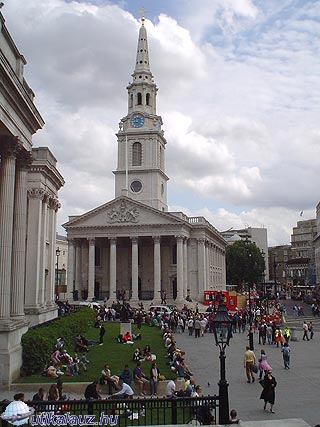 Ezután a Northern vonalon a Charing Cross-ig mentünk. Onnan először a Trafalgar tér sarkán  álló oszlopos templomot, a  St. Martin-t néztük meg (egyszerű templombelső, faragott szószék, görög oszlopos kialakítás). A templom alatti kriptát, altemplomot vendéglőnek rendezték be. A padlószinten régi síremlékek kövei látszanak a vendéglői asztalok, székek mellett.