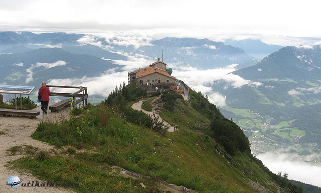 Egy helyi buszállomásról indul a felső buszállomásig a járat, kizárólag ezzel, vagy gyalog lehet feljutni. 7,40-kor indult az első járat, főleg a mi csoportunk foglalt helyet az induló járaton (a felnőtt jegy 14,50 euróba kerül). A felső buszmegállótól lifttel mentünk fel az 1832 m-en fekvő Kehlstein-házhoz, magyar elnevezéssel a Sasfészekhez. Az épületet a II. világháború végén a felső úttal együtt lebombázták, majd a házat újjáépítették, vendéglőnek használják. A történelmi eseményekre semmi sem utal. A külső teraszról szép kilátás nyílik a berchtesgadeni hegyekre, itt is egy kioszk működik. Egy kis emelkedő út vezet a csúcsra. Itt állítottak fel egy keresztet havasi gyopár díszítéssel.
