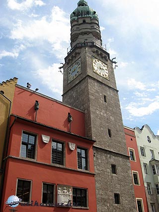 A séta után visszatértünk lifttel és a lefelé induló buszjárattal a kiindulási helyszínre, majd a saját busszal indultunk tovább 10 órakor Tirolba. Egy soron kívüli megállásunk volt magas hegyekkel övezett, Inn folyó melletti Innsbruckban, ahova 13,30-kor érkeztünk. Itt már gyönyörű napsütéses idő fogadott bennünket. Ha már arra jártunk, egy rövid, 1 órás városnézésre indultunk az elkerített városi parkon (Bundesgarten) keresztül. A park útjairól kitiltották a kerékpárosokat, csak gyalogosan lehetett átmenni. A  kijáratnál konflis kocsik várakoztak, utasra várva. Az óvárosrészre értünk, ahol kis sétát tehettünk az ódon és új házak között. A keskeny utcákon ajándékboltok,  sörözők, turistacsalogató boltok  sorakoztak rengeteg látogatóval. Arrébb a Hofburg épületét és a tornyos Városházát nézhettük meg.