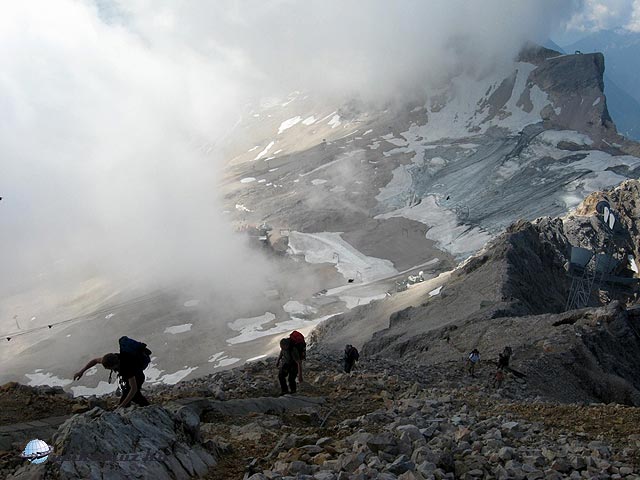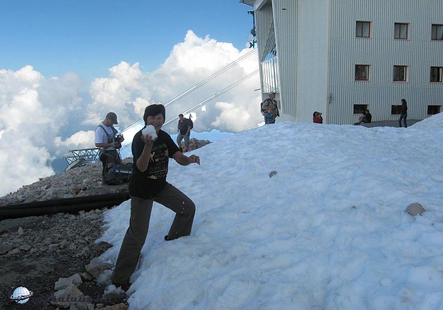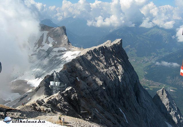 Ma is 9-kor indultunk a busszal Németország legmagasabb hegycsúcsának, a Zugspitze-nek a meghódítására. Az ausztriai oldalon, Ehrwald település mellől indultunk  felvonóval 10,30-kor. Mindannyian felfértünk egy kocsiba, de csak állóhelyeket kaptunk, annyira tele volt már az odaérkezésünkkor. 33 euró egy felnőtt jegy, mi  csoportosan 29 euróért kedvezményesen kaptunk jegyet. Az üvegablakokon keresztül láttuk az alattunk fekvő mélységben  a tavat, erdőt, majd magasabban már csak a sziklafalakat. Fent egy kiépített zárt, üvegfalú komplexum várt,  étteremmel, különböző  kiszolgáló létesítményekkel. Kijutva a felső körbefutó teraszra, felejthetetlen látvány fogadott bennünket. Hatalmas sziklafalak, felhőpamacsok, hófoltok, egy helyen szánkópálya (legalábbis fentről annak látszott, mozgó, sikló alakokkal).
