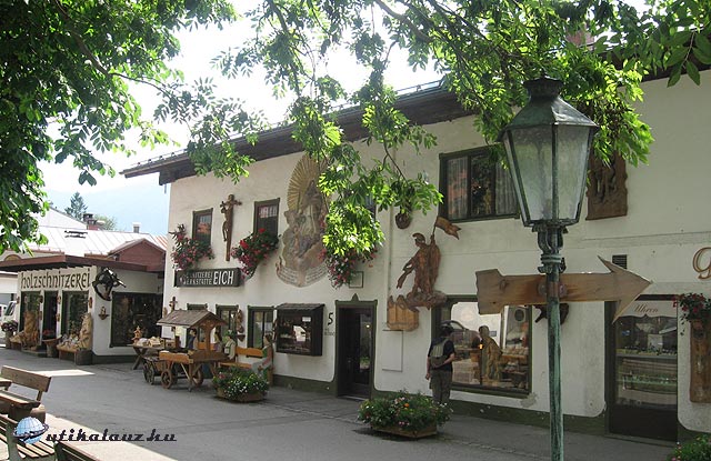 13 órakor visszaindultunk a felvonóval, most jó ülőhelyet kaptunk.13,40-kor indultunk a busszal Oberammergauba, másnapi kiemelt programunk helyszínének előzetes felmérésére. 14,30-kor érkeztünk, egy nagy buszparkolót találtunk a település központjától nem messze. A kísérőink bementek a másnapi passiójáték helyszínére. Néhány utasnak nem volt előreváltott jegye, hátha sikerül még kapni. Nem sikerült… Mi bejártuk  az Ettaler strasse-t, a helyi Peter-Paul templomban is szétnéztünk. A gyönyörű festett házak a település nevezetességei (az útikönyv is kiemeli a „Piroska és a farkas”, valamint a „Jancsi és Juliska” meseképeit bemutató festett házakat). Szinte minden házat le lehetett volna fényképezni…Némely házra körte-, vagy almafa van felfuttatva.