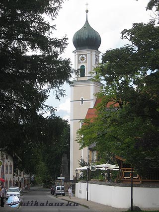 Indulás 8,30-kor 18 fővel, akik az előre váltott belépővel rendelkeztek. 10 órára érkeztünk Oberammergauba, még bőven volt parkolóhely a busznak, de már nagy nyüzsgés fogadott bennünket, biciklis riksák kínálták szolgáltatásukat, sorra érkeztek a különbuszok. Egy kis séta után  felmentünk a központban a dombon álló, temetőkerttel körülvett Peter-Paul templomba.