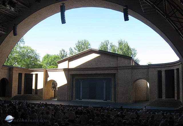 Az előadás 14,30-kor kezdődött, előtte bejártuk a környéket. Nevezetes a Pilatushaus is, amely múzeumnak van berendezve, de a látogatók műalkotás közben láthatják a fafaragó és a rézműves  mestert. A színhely egy hatalmas csarnok, a színpad felől nyitott. Az előcsarnokban a régi előadások képeiből látható kiállítás. A nézőtér 5000 személyes, az oldalsó bejáratokon egy időben  lehet belépni, nincs tolongás. A széksorok elég sűrűek, az én lábam csak oldalvást fért el és a sorok lejtése is enyhe volt, néhány alacsonyabb néző bosszankodott, az előtte ülőtől kevesebbet látott a széles színpadon zajló  jelenetből A színpad  tehát 42 m széles, beton elemekből áll, középen az élőképeket is bemutató függönnyel is ellátott belső színpad. Két oldalt oszlopokkal  és körboltozattal ellátott  részeken a szereplők bevonulhatnak.