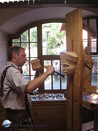 Utána lesétáltunk a buszparkolóba, egy padon elfogyasztottuk szerény ebédünket. Ezt követően elindultunk a passiójáték helyszínére (Passions-Theater) a központba. Ajándékboltok, kihelyezett vendéglői teraszok, további szép festett épületek között vezetett utunk.