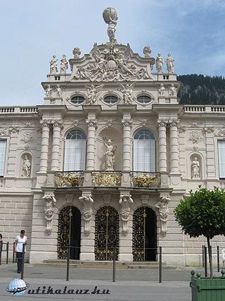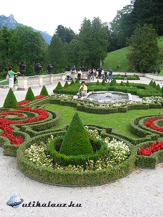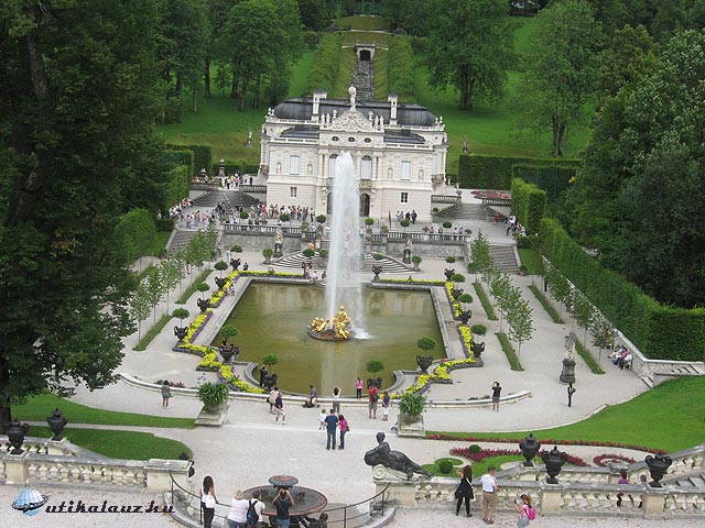 Az aranyozott virágok és a szoborcsoport között 30 méteres szökőkút vízsugara emelkedik (csak időközönként indul be). A kastélyba belépve az előcsarnokban XIV. Lajos, a bajor király példaképének kicsiny lovasszobra áll. Beljebb gobelin szoba, fogadószoba, hálószoba, tükörszoba, mind fényűzően berendezve, szintén magyar nyelvű kísérőszöveg hangzott részünkre. Kb. 30 perces látogatás után felmentünk a kastély mögött emelkedő 30 márványlépcsős teraszra. Onnan a Neptun szoborra és az alatta levő medencébe folyik a víz, körbe virágtengerrel.