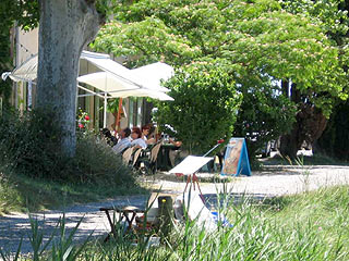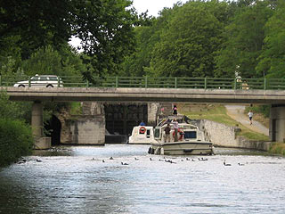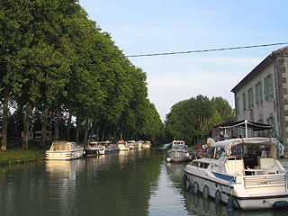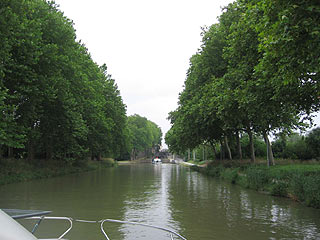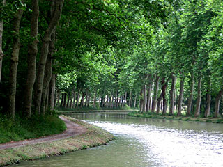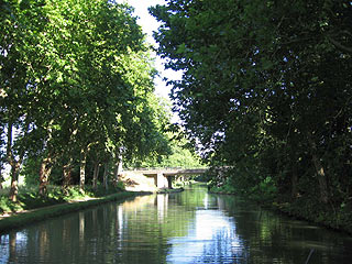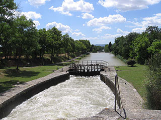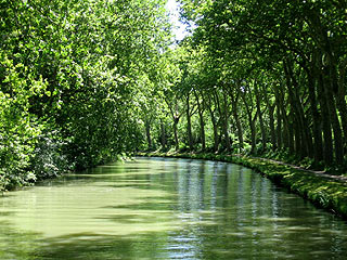 A mi választott csatornánk, a Canal du Midi, a világörökség része. (Kialakulásáról sok helyen lehet olvasni, ezzel nem szaporítom a szót.) Árnyat adó platánfáinak gyökerei különös alakzatokat képezve markolásszák a csatornát, remek búvóhelyül szolgálva kacsáknak, vidrának. Sajnos, emberi fürdőzésre nem alkalmas. A parton szinte mindvégig kényelmes sétaút, sok esetben kiépített bicikliút van. Ez itt egyébként afféle kötelező sportág, nem egyszer láttunk családi bicikliseket kisebb konvojokban, de az sem volt ritka, hogy a papa biciklijéhez csatolt utánfutóban a csomagok, a mamáéban két gyerek szunyókált. Mindenki üdvözli a hajósokat – mi is lelkesen integettünk, bon jour-oztunk húszpercenként. A mosoly és a jóindulat megint csak kötelezőnek tűnik… A zsilipek körül néhol a zsilipőr ráérő idejét bizonyítandó kis gyümölcsös, veteményes, hobbifaragványok, mini skanzen-szerű gyűjtemény régi zsilipőri és földművelő eszközökből és mindenütt burjánzó,virágzó kertek, amelyekben szelíd kutyák, néha mókusuk futkároznak… Itt-ott vásárolni lehet kenyeret, sajtot, bort, vagy frissítőket fogyasztani, ritkábban étkezni is.