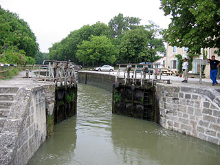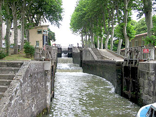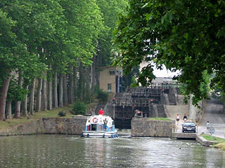 Mi Bramból indultunk. Barátaink tapasztalatai szerint először felfelé mentünk, hogy friss erővel tanuljuk meg a zsilipezést (rögtön az első napon volt benne bőven részünk, 16-on mentünk keresztül…), aztán le, majd az utolsó napon megest felfelé, vissza Bramba. A rövid idő alatt, ami rendelkezésünkre állt, két figyelemreméltó városkát tekintettünk meg, Castelnaudary-t és Carcassonné-t. Utóbbi az igazán nagyszerű – középkori várában élénk turistaforgalom mellett zajlik az élet. (Érdekes, hogy a mai város belső része este nyolc körül szinte elnéptelenedik, míg a Vár vendéglői, kávézói olyankor telnek meg igazán. Amúgy a városkákban minden héten, meghatározott napokon vásár van, s nyáron minden hétre esik valamiféle városi fesztivál is – csak éppen ki kell fogni. érdemes előre tájékozódni.)
