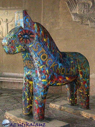 Az ajándékhoz néhány megjegyzés: A svéd jelkép a dala-ló (a képe jobbról) , ami egy festett fa lovacska. Ez nagyon változó árakon kapható. Nem is olyan olcsó, hiszen egy 5 cm-es 110 Kr., van ahol 145-ért adták. Van azonban kisebb változata is és más anyagból készült is, ezek jóval szerényebb árakon. Hűtőmágnes formában is kapható már 30 Kr-ért. Csoki is van ilyen, egy dobozban 10 db külön-külön becsomagolt lovacska van és az ára 39 KR.