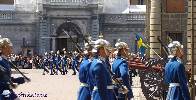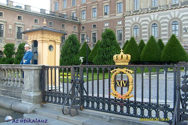 Végre elérkeztünk a Királyi palotához, ahol a pénztárnál 4 részre lehet megvenni a belépőket külön-külön 100-100 Kr-ért. Ez a 4 rész a palota, a Kincstár, a Kronor és a Gustav muzeum. Aki már kettőt tervbe vett, annak érdemes inkább kombinált jegyet venni 140 KR-ért. Mi a palotával kezdtünk, majd a Kincstárban voltunk. Sajnos a kincstár melletti Kápolnát nem tudtuk megnézni, mert az csak szerdán és pénteken van nyitva. Mivel már dél volt, ezért kimentünk a belső udvarra, ahol már a sok turista gyülekezett, mert 12,10-kor kezdődik az őrségváltás mindennap. A közel 3/4 órás parádé nagyon tetszett nekünk és nagy sikert aratott a zenekar, mikor ABBA dalt is játszott.