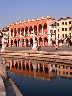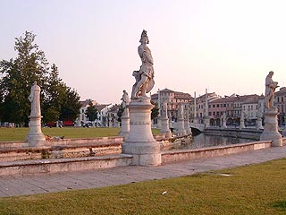Már a buszablakból feltűnik, mennyire szeretik az olaszok a növényeket: ahol csak lehet, fa, fű, virág díszít és hoz természetközeli érzést a kőrengetegbe. Míg leparkol a busz, Zsuzsa tájékoztat, hogy idegenvezetni csak helyiek jogosultak, tehát ne lepődjünk meg, ha nem mindenhol beszél, vagy hirtelen elhallgat. Kezébe veszi a számunkra tájolópontnak szánt pálcát a tetején a nemzetiszín szalaggal és indulás. Ahogy a parkoló melletti, amúgy szintén klasszikus vonalú épület kapuján átmegyünk, máris a történelem közepén érezhetjük magunkat: ez a Prato de la Valle, a város főtere. A tér nagyjából szögletes, van vagy két focipályányi, szépen felújított épület-szépségek állják körül. Az előttük elvezető úton belül kör alakú füves terület. A gyep szélén faragott kövekkel szegélyezett vizesárok fut körbe, a körbezárt területre négy hídon lehet bejutni. Az árok partján és a hídfőknél az 1222-ben Páduai Szt. Antal alapította egyetem híres-neves diákjainak fehér márvány szobrai állnak szabályos rendben . Itt található Galilei, Dante, Ariosto, Tasso és még további 78 között a mi Báthory Istvánunk szobra is, aki nemcsak Erdély, de egy ideig Lengyelország fejedelme is volt. (És még mondja valaki, hogy a tudás nem hatalom…) Ezt a történelmi levegőt szívja néhány a pázsiton alvó szakadt is, körülöttük szemét, ágybetét gyanánt használt kartondoboz, újság. A mobil esőztetők körbeforgó vízsugarai tapintatból még nem érik el a szendergő csapatot, lehet hogy a kertész is volt homeless? Elindulunk a térről kivezető utcák egyikén. Az út kockaköves, járda nincs, a házak árkádjai alatt vonulunk, így még döbbenetesebb az utolsó alól kilépve a látvány: a tér és a közepén álló St. Antonio bazilika hatalmas tömbje. A kora reggeli álmos hangulatot a reggeli misére siető pár papnövendék és apáca zavarja csak, utánuk újra ellepik a galambok az egész teret. Odébb, a bazilika főbejáratától távolabb egy bronz vitéz ül, alá egy lovat is öntött alkotója. Kezében nincs kard vagy lándzsa, hogy a galambokat kézzel el tudja hessegetni. A bemutatkozásnál kiderül, ő Erasmo de Narni, a zsoldosvezér, de a háta mögött egyszerűen csak Gattamelata-nak hívják, ami hízelkedő macskát jelent, utalva mindenkinek mindent megígérő tárgyalási módszerére. A metódus működik, amíg az embert meg nem ismerik, ezért ma már ez nem divat…vagy mégis?