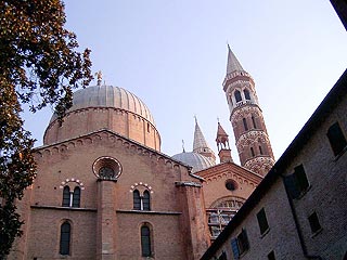 Belépünk a bazilikába és egyszerre mindenkit körülvesz az ájtatos csend. A miséző pap hangja mintha egészen távolról hallatszana, a padokban barátok csuhái és apácák fityulái keverednek dzsekikkel és pólókkal: mintha egy középkori film forgatási szünetében lennénk. Már a mellékhajó is veri a hazai templomok belső méreteit, a főhajó és a kupola pedig grandiózus. Körüljárjuk a látnivalókat illedelmesen tipegve, hogy a misét és az áhítatot ne zavarjuk. Rögtön balra a névadó Páduai Szt. Antal kápolnája és sírja. Sokan állnak itt imára kulcsolt kézzel, szemüket a márvány szarkofágra függesztve, van aki meg is érinti, hogy némi malaszthoz jusson. Az érintésnek állítólag varázsos ereje van, erről tanúskodnak a hálaadó márványtáblácskák körben. A főhajó mennyezetén a freskókat Giotto és tanítványai festették a névadó szent életéből vett jelenetekről. A mellékhajók egy – egy része önálló kápolnaként van kialakítva, van pl. a Fekete Madonna kápolnája, másikban Szt. Antal relikviái találhatók, megint máshol a benedekrendieknek szenteltek helyet. Innen az út egy belső udvarra, az ú.n. kerengőbe vezet. A négyzetforma, épületek közrezárta udvar köré csodaszép oszlopsoron nyugvó árkád fon koszorút, innen a kerengő elnevezés . Az udvar közepén óriási tulipánfa ad árnyékot és elmélkedéshez, meditációhoz illő hangulatot. A kerengő egy pontjáról szép rálátás adódik a bazilika kupolájára, tornyaira. A nagy kupola szabályos félgömbje a kortól és irányzattól független klasszikus szépséget képviseli, mellette a nyolcszögű harangtorony félköríves boltozatú, terrakotta – fehér díszítésű ablakaival a mór beütést példázza, az oldalhajók felezőjében álló dísz-tornyocska légiesen karcsú oszlopaival már mintha az építésekor még nem is létező gótikával kacérkodna. Ne felejtsük el: mindez a XIII. században épült és sokszínűsége mellett is egyfajta egység, harmónia érződik rajta. Elhaladunk a konzisztórium (papi tanács) dísztelen épülete előtt, még egy szabadtéri szoborpark következik és már ismét kinn vagyunk a világi világban. Zsuzsa itt szélnek ereszt bennünket, az indulásig hátralévő egy órát ki-ki maga szervezheti.
