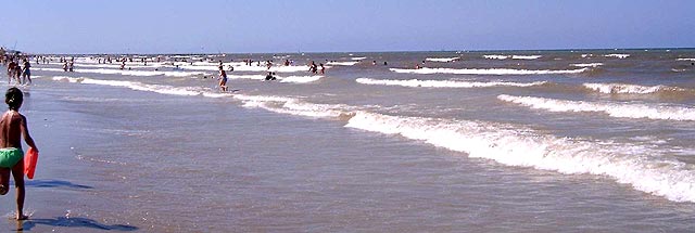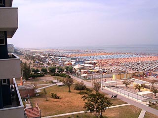 Lassan beérünk Riminibe. A város maga nem az olasz építészet ékköve, már hogy ilyen virágnyelven mondjam, mert lapos, unalmas és alig van benne látnivaló. A véreskezű Malatesták uralták a középkortól a reneszánsz derekáig. Hatalomvágyuk, pénzéhségük, de még szerelmük útjába sem állhatott senki és semmi, ugyanakkor bőkezűen pártolták a művészeteket. A fülledt emlékű belvárost elkerülve jutunk a part közelébe. A szállodák, panziók, hotelek sakktáblaszerű, szabályos rendben épültek több tíz kilométeres hosszban a part mentén. A tenger örömeinek hódolók tömegei kapnak itt szállást, többnyire ugyanabban a minőségben. Itt nincs luxushotel, de nyomorúságos garniszállót se találni: a szállásadók a széles középrétegben találták meg a számításukat. A part felé haladva kiérünk a promenádra, azon túl már a spiaggia, maga a finom homokú strand húzódik. Mindezt már a buszablakból felmérjük és a lágyan hullámzó tenger látványa kiveri az álmosságot a szemünkből, máris kész az első napi haditerv: lerakjuk a csomagjainkat és azonnal lemegyünk fürödni . Nem kell ezen mosolyogni, a magyar - ha tengerre jut - tűnőnek érzi és félti a csodás körülményeket: a tűző napot, a homokos partra lustán kifutó hullámokat, a hajók füstjét, a tenger felől fújó gyenge szelet. Hamar, el ne múljon ez a délibáb, vessük bele magunkat, míg buborékként szét nem pattan. Szerencsénk van, a szállodai szobánk ablakából semmi sem zavarja a kilátást: a parti sétányon túl lapostetős, földszintes épületek, színes ernyők, napozóágyak rendezett sora kíséri a part vonalát a párás messzeségbe. Már a napernyők színeiből is látszik: ezeket a strandbútorokat szakaszonként más-más bérlő adja ki és szed a használatukért némi eurót. A bevétel egy része a várost illeti, a maradék a bérlő haszna, de ezért rendben tartja a területét. A promenádtól a vízig tartó kb. 50 m széles sávon tehát ilyen egymással párhuzamos bérelt területek valamelyikén tudsz lejutni a partra. A strandbútorok használata persze nem kötelező, a parti kultúrzónán túl van egy sáv a nomád lelkületűeknek, ott szabad leteríteni a pokrócot, fürdőlepedőt a fövenyre és vörösre égett bőrrel áldozni Napisten oltárán. De hát milyen magyarok lennénk, ha a napfényes Itáliában az árnyékért fizetnénk?! Bár Zsuzsa felvilágosított, hogy a bérelt területen szabad az átvonulás, mégis van némi feszültség bennünk, ahogy közeledünk a bejáratnál posztoló manyushoz. Úgy érezzük, mint a bolondok házából épp szabadult ápolt: jó, jó, én tudom, hogy nem vagyok egy szem kukorica, de vajon a kakas is tudni fogja?!