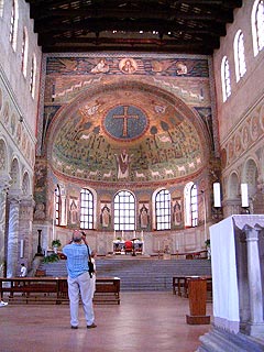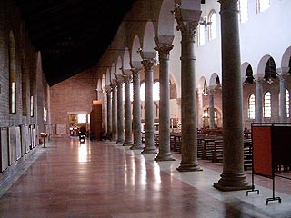 A busz klimatizált utasterének hűvöse a megváltás maga, pedig még lesz egy „merülésünk”: a várostól úgy 10 km-nyire áll a San Apollinare in Classe bazilika. Valaha itt terült el Classe, Ravenna kikötővárosa, ma már a feltöltődés miatt messze esik ide a part . A bazilika épülete így magányosan elég furán hat itt a semmi közepén, néhány pínea állja csak körül. Gondolom, ide csak a csoporttal érkezőket hozzák ki, szóló turisták aligha zarándokolnak ki hozzá és ez meg is látszik: alig lézeng pár ember. A bazilika külseje a ravennaiakhoz hasonlóan dísztelen tégla, inkább néznéd magtárnak vagy laktanyának. A belseje minderre rácáfol: az igazán nagyléptékű belső vetekszik a mi esztergomi vagy pesti bazilikánkkal. A mennyezet már maga egy műszaki csoda: becslésem szerint 30 métert hidalnak át a dísztelen, sötétre érett gerendák. A nemes római arányokat követő főhajó oldalfalait 24 finoman erezett szürkés oszlop tartja, az oszlopfők elefántcsont színű feje bizánci stílusú. A főhajó oltár feletti boltozatán St. Apollinare legelteti jó pásztorként a hívőket jelképező bárányokat mozaikilag. Látszik a csapatunkon, hogy agyilag túlcsordultak ennyi történelem és műemlék láttán és szellemileg már csak arra jók, hogy a vacsoránál eldöntsék, vajon tonhalas babsalátát vagy minestrone levest vételeznek-e a terülj-terülj asztalkánkról. Még felvesszük a vidámparkolásban félig meghalt testvéreinket és irány Rimini!