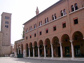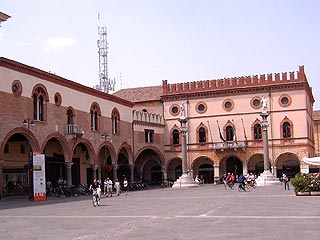 Ide már csak egy pár lépés a Piazza del Popolo, a Népek Tere. A nem túl tágas tér egyik hosszanti oldalát a Palazzetto Veneziano árkádos, tégla borítású épülete uralja. Az épület stílusában erősen hasonlít a velencei Szt. Márk téren álló Doge palotára, talán csak az itteni galambhiány utal az eltérő helyszínre. Rá merőlegesen a tér rövidebb oldalát a Városháza épülete zárja le. Az épületet a város két védszentje, Vitalis és Apollinaris vigyázzák egy-egy oszlop tetején. Ilyen magasban az ember örül, ha le nem esik, ezért alkotójuk adott egy pásztorbotot ill. egy lándzsát a kezükbe, hogy legyen mivel egyensúlyozniuk. Így persze a védelmük elég amatőr szintű, már csak azért is, mert az a két csórag még fejmagasságig sem ér le. Az őrző-védő szakma nem itt kezdődik…