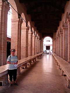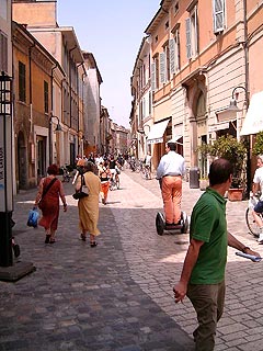 A sofőrünk szól, mi kinyitjuk az ejtőernyőinket és ugrás: a mögöttünk kígyózó végeláthatatlan kocsisort nem illik sokáig feltartani. Némi kevergés után eljutunk a város méretéhez képest illetlenül kis történelmi maghoz. Bevezetésként felkeressük a piacot, de itt sincs szerencsénk: délután már csak a tésztákat, konzervet és borokat lehet venni a reggel nyilván nyüzsgő vásárcsarnokban. Bánatomban csinálok egy felvételt a tésztákra specializálódott áruda kirakatáról, hogy a taljánok millió tésztaféléje és elnevezése között rendet csapjunk és végre megtudjuk, milyen is voltaképpen a nyokki (gnocchi) kinézetre. Ezután nekivágunk a helyi történelem és építészet emlékeit sorra járni. A város teljhatalmú és rettegett urai, a Malatesták által építtetett templomot találjuk meg az okos könyvem szerint, aztán a Szt. Antal templomot bámuljuk meg a Három Mártír terén, végül pár sarokkal odább bejutunk a hajdani városközpontba . A főterüket a Malatesták vára uralja afféle önkényuralmi jelkép gyanánt. Hatalmas, komor tömbje a kisvárosi házak között segít felidézni a megfélemlített városlakók rettegését és sajátos ellenpontként megérteni a firenzei csodát: az ember ott tudott csak igazán kibontakozni, ahol az értelem és az érzelmek szabadon szárnyalhattak ma is megcsodálni való magasságokba. Pedig a Malatesták is támogattak néhány szervilis művészt, de hát a kegyencek sorsa már csak ez: feledésbe merülnek „műveikkel” együtt. A tér lakóházaihoz a halpiac klasszikus szépségű, de emberléptékű épülete illik szépen: a háromhajós, nyitott csarnok fényesre koptatott kőasztalainál sok hal és még több információ cserélhetett gazdát az évszázadok alatt. Eljátszok a gondolattal, hogy a középkorban jég és hűtőszekrény nélkül egy nyári napon úgy délután 3 körül a mindent betöltő bűzre itt kalapot lehetett akasztani úgy nagyjából. Szegény szomszédok… Viszont a koleszterinszintjük nem idegesítette őket.