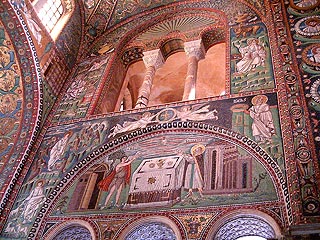 Zsuzsa az úton mesél Ravenna múltjáról. A város érdekesmód akkor virágzott fel, mikor a római birodalom csillaga már leáldozóban volt. Rómát a császárok elhagyták, a császárság kettészakadt és a bizánci félbirodalomhoz nem tartozóak székhelye átmenetileg Ravenna lett és egyúttal hadikikötőként a keleti tartományok kapuja. Ahogy az okos könyvem festőien írja: „Itt lobbant utolsókat a római kultúra, amelynek mécseséből kifogyóban volt az olaj.” Heveny hadakozások után a gótok vették birtokukba aztán, végül Bizánc helytartója székelt itt vagy 200 évig. A relikviák ma is kifogástalan állapota azonban korántsem a középkori őrző-védők elszántságának, sokkal inkább az elhagyatott várost feltöltő üledéknek köszönhető. Ez az mocsár nem hagyta a kincsvadászokat a város híresen gazdag régészeti leleteihez jutni. A város legfőképp a kifogástalan állapotban megmaradt mozaikjairól híres, melyek stílusára az épp hatalmon lévő náció kultúrája hatott erősen. A római és a gót periódus mozaikjaira a mozgékony alakok, a kifejező arcok, a természetes színű (kék, zöld) háttér a jellemzőek, míg a bizánci korszakból az arany háttér előtt mereven álló, gazdagon ruházott stilizált alakok származnak.
