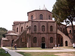 A villanegyed felől érünk be a városba, a kétszintes lakok közt pineák, tuják, cédrusok adnak árnyékot, beljebb sűrűn beépített, városias kép fogad. A busz a belváros peremén rak le, itt már egy ménkű vastag kőfal darabja jelzi, hogy beléptünk a történelembe. Elsőként a St. Giovanni templomot látogatjuk meg, amit Galla Placidia császárné építtetett egy tengeri viharból való megmenekülése emlékére . A templomra nemes egyszerűség, világos, harmonikusan szép belső tér jellemző. Építésekor nyilván nem lehetett divat ez a puritán egyszerűség, erről a kiállított mozaik-részletek árulkodnak. A szomszédos téren a nemzeti hős, Garibaldi márvány szobrának lábánál friss virág hirdeti az olaszok határtalan tiszteletét és büszkeségét. Amúgy itt talán nincs is város ilyen nevű utca, tér nélkül, akár nálunk Kossuth, Bem vagy Petőfi nélkül.