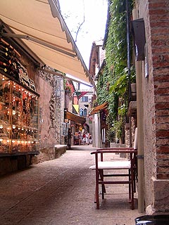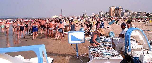 Elfogyott a fröccs, de most azt sem bánom, csak ülök, arcom simogatja a finom, bársonyos tengeri szél. A parti korzón már élénkül a forgalom: a tikkadt déli órák és a vacsora után éled a tengerparti nép: közeledik az esti csúcsforgalom. A délutáni alvás után most frissek vagyunk, lemegyünk mi is hömpölyögni. A vendéglőcskék megtelnek, némelyik kerthelység teraszán gitár vagy csengő tenor idéz ismerős olasz dallamokat. És a nagyérdemű vevő nemcsak a dalokra, de mindenre: a boltban a mama strandpapucsot, pálmafás úszógumit vagy tengeri csillagokból, kagylókból álló csomagocskát vesz az otthonmaradt unokájának, van itt parti homok üvegben, ébennek látszó fából készült, valószínűtlenül vézna bennszülött alak lándzsával a kezében, ledér nővel díszített fürdőlepedő és valódi műmárkás napszemüvegek. Az egész nagyon hasonlít arra, amit a görög Paralia-n láttunk azzal a kivétellel, hogy ide az ukrán maffia még nem tette be a lábát: nincsenek szőrmeboltok csillogó kirakattal, márvánnyal lerakott előtérrel, nerccel és hermelinnel. És épp ez a bajom: ez a tengerparti kavalkád lehetne a Földközi tenger bármely partszakaszán, semmi olasz nincs benne, egy globalizált világ globalizált termékeit kínálják a globalizált vendégeknek.