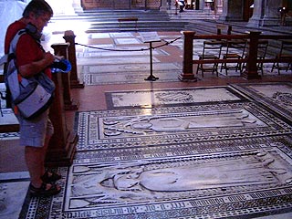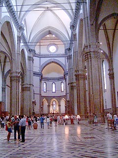 Újra a téren, amely sima és dísztelen, csakúgy mint a koros, de ódon házak. Eltűnünk a térről kivezető egyik sikátorban és az egyik kanyar után egy igazi épületkolosszus magasodik fölénk, a Dóm, pontosabb nevén Santa Maria del Fiore (a Liliomos Szűz) katedrális. A látvány olyan sokkoló, mintha egérlyukban elefánttal találkoznál: a Dómot szinte teljesen körülépítették, szabad tér, ahonnan távlatból csodálni lehetne, alig maradt. Megnézheted a grandiózus kupolát, a főbejáratot, a harangtornyot vagy a keresztelő kápolna bronz domborműveit külön-külön, de katedrális arányairól, harmóniájáról fogalmat se alkothatsz: ehhez távlatból kellene látnod . Gullivert járhatták körül a törpék ilyen tanácstalanul és jöhettek rá idővel, hogy jé, hiszen ez egy ember! Míg mi tátjuk a szánkat és fényképezzük vadul a kupola restaurálásához felállított állványerdőből kilátszó részeket, Zsuzsa tájékozódik és megveszi a jegyeket aztán beállunk a hosszan kígyózó sorba. Most jövünk rá, hogy a templom méretei nyilván azért akkorák, hogy az összes sorban állót takarni tudja a tikkasztó déli nap elől. Zsuzsa mesél, míg bejutunk. A Dóm a XIII. században épült, híres építőmestereknek adott vagy ötven évig munkát. Ezek közül is kiemelkedik Brunellesci, aki a kupolát építette fel égetett agyagcsövekből. Akkoriban ez a metódus nyilván könnyűszerkezetesnek számított és lehetővé tette, hogy a kupola aládúcolás nélkül(!) épüljön fel. A kupola legmagasabb pontja 97 m, de a lanternával (a kupola csúcsát díszítő, lámpáshoz hasonló felépítménnyel) együtt 107 m, ami az itáliai templomok versenyében a toplistás, de egy ideig listavezető is volt. Hogy a szerénységet és az evilági hívságok tagadását papoló kereszténység hogyan bonyolódott ebbe a megalomán versenybe, nem tudni, egy biztos: óriási áldozatokat hoztak a mindenkiénél nagyobb Isten háza felépítéséért. A verseny nem hivatalos Európa-rekordját a római Szt. Péter bazilika tartja, ahol nem átallották a versenyben kvalifikáltak hosszméreteit a padlózaton és a vatikáni bazilika díjnyertes voltát pedig a hívő lelkekben jelezni.