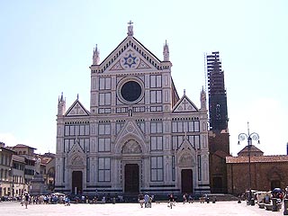 A templomot a koldusszegény ferenciek közadakozásból Arnolfo di Cambio mesterrel építtették sírhelyet ígérve a templomban az adakozóknak. A téglából épült templom puritán egyszerűségű homlokzatát csak a XIX. században borították fehér márvánnyal, de nem tettek jót vele: a szemnek ugyan vonzóbb lett, de már nem illeszkedik a tér egyszerűségéhez, ahhoz a tiszta racionalizmushoz, dísztelen szépségideálhoz, amit a város jelképezett évszázadokon keresztül. A megváltott síremlékek egy része a főoltár mögötti padlózatba illesztett díszes zárólapok alá került, a domborművek vonásait a vendégek csoszogása már kivehetetlenné simította. A város nagy szülötteinek a mellékhajókban emeltek nagyszabású emlékhelyeket, itt találjuk Michelangelo, Alfieri, Machiavelli és Rossini mauzóleumát és némi kegyes csalással Dantéét is, bár tudjuk, az ő hamvai Ravennában nyugszanak.