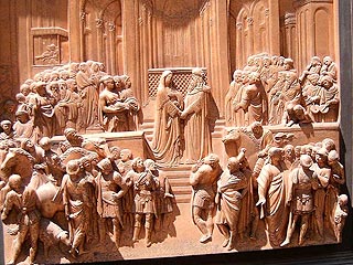 Ismét kint, körüljárjuk az olasz hagyományok szerint külön épült harangtornyot és keresztelő kápolnát (itt a külön időben is értendő). A Dómmal való rokonságukat a márványborításon kívül a nyolcszögletű alap jelzi. A keresztelő kápolna (battistero) három nagy bronzból öntött kapuja közül a dómra néző keleti kapu a leghíresebb. A kapu domborműveit Ghiberti, az első igazán reneszánsz szobrász alkotta és nem hiába nevezte a nagy pályatárs, Michelangelo a Paradicsom Kapujának: szépsége alapján akár ott is állhatna. Szerencsém van, a nap épp súrolóan süt, a fény és az árnyék plasztikusan kiemeli majd a fotókon a dombormű részleteit.