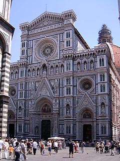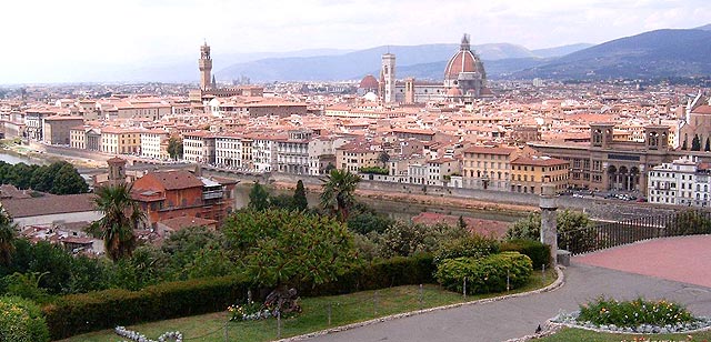 Az autópályán közben tömegek autóznak dél felé, nyilván hőgutától elborult aggyal eltévesztették a hűvösebb mérsékelt égövi zóna irányát. Zsuzsa aztán rávilágít a lényegre: Bologna környékén a tengerpart fürdőzésre használhatatlan és a legközelebbi homokos partszakasz délebbre, Rimininél kezdődik, oda hajtanak a digók. Elhagyjuk Faenzát, amely a fajansz hazája és névadója és hamarosan elérjük Bolognát. A város neve vöröset jelent, pontosabban az épületei után téglavöröset, de erről nem lesz módunk meggyőződni, mert buszunk egy katonás balraáttal elhagyja az autópályát és befordul a hegyek közé. Ligetes erdők és művelt területek borítják az amúgy nem túl termékeny talajú dombokat, melyek aztán hegyekké magasodnak és mire elérjük az Etruszk - Appenninek hágóját, már 1000 méteren vagyunk és még derekasabb csúcsokat is látni messze. Félórányi szerpentinezés után érünk le az Arno völgyébe és művelt dombokon már észre is lehet venni a nagyváros, Firenze közelségét: egyre több a cédrusok, píneák, oszloptuják övezte villa, lakóház. A házak aztán egyre egyszerűbbek és egyre sűrűbben vannak és hamarosan beérünk. Busszal nem szabad a belvárost megtámadni: egy derekas méretű parkoló a külvárosban már csaknem tele, ma is lesz vendége a műemlékeknek. A hőség tikkasztó, de száraz, felvesszük az óvszereket és nekiindulunk az Arno kikövezett partján a történelmi központ felé. Úgy egy negyedóra, míg beérünk, addig elmesélem a liliom (fiore) városának, Firenzének (olaszul Fiorenza-nak) a történetét. A környék már az i.e. VIII században lakott volt. Bár nem tengerparti város és ebből az egyszeri halandó kevésbé viharos történelmet gondolna kikövetkeztetni, a barbárok, a bizánciak, a gótok és a longobárdok is megdúlták, de függetlensége bizonyos mértékig mindig fennmaradt. Az ezredforduló táján kap erőre és egy tartós fellendülés teszi erőssé és ellenállóvá, Itália mindenkori fényes csillagává. Ez a stabilitás a melegágya és a mindennapok demokráciáján öntudatosodó polgár a csírája a tudomány és a művészetek tartós virágzásának, amelyet elég ha olyan nevek jeleznek, mint Dante, Giotto, Boccaccio később Leonardo da Vinci, Giordano Bruno, Michelangelo. A nagyhatalmú Medici család, de különösen két tagja: I. Cosimo (az Öreg) és Il Magnifico (a Nagyszerű) mecénási bőkezűségének is köszönhetően itt ring az egész Európa szemléletét évszázadokra meghatározó humanizmus bölcsője, ez teszi a várost a reneszánsz kor Athénjává. Már szédültök? Biztos ez a kuka meleg teszi, de már itt is vagyunk a Santa Croce (Szt. Kereszt) templomnál, majd benn hűsölhetünk!