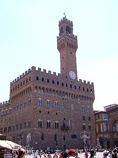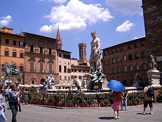 Kiérünk a főtérre, a Piazza della Signoria-ra. A teret kétségtelenül a városháza (Palazzo Vecchio) uralja. Szögletes tömbjének egyszerűségét fokozzák durván faragott kövei, csak ablakaival díszített sima falai. Az épület várszerű jellegét a tetején körbefutó árkádos körfolyosó és a térről fogazatként látszó gyiloklépcső emeli ki, melyet a majd még egyszer olyan magas, aszimmetrikusan elhelyezett torony jól ismert, buzogányszerű sziluettje koronáz meg. A főbejáratot nem kisebb híresség őrzi, mint Michelangelo Dávidja, akiről később kiderül, hogy biztonsági okokból csak egy hasonmás. Az amúgy dísztelen főteret a Neptun-kút teszi kicsit berendezettebbé.