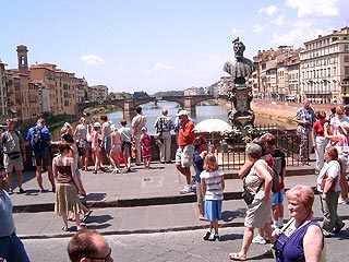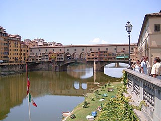 A folyóvíznek már a látványa is megdobja a fásult társaság érdeklődését és van is mit nézni: épp a legjobban fényképezhető távolságban vagyunk az Öregtől, a Ponte Vecchio-tól, melyet a fecskefészekként ráragasztott műhely-boltok után az Aranyművesek-hídjának is hívnak. Úgy éljek, néhány kőműves szerszámot elnyelhetett az Arno, mire ezek a víz fölé lógó sufnik kész lettek és talán néhány pallér is vett spontán úszóleckét. Ez Firenze egyetlen hídja, amely a II. világháborúban épen megmaradt egy a kultúra egyetemes értékeit kellően tisztelő német tisztnek köszönhetően. A hídon nincs az embernek híd-érzése: a kétoldali bazársor közt hömpölyög az idegenforgalom, a boltokban folyik a hídi vásár, alul meg az Arno. Még szerencse, hogy a híd közepén nem engedték az aranyművelést, onnan szép a kilátás a folyóra, a többi hídra.