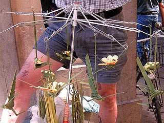 Zsuzsánk ad egy óra kimenőt táplálkozásilag, de a kiadós reggeli emléke még gyomrunkban él, hát nekiindulunk nézelődni. A főteret irányozzuk be és őgyelgünk bámészkodva. A sétálóutcán forgalmas és nemcsak fényképező, bámészkodó turistákkal találkozunk, céltudatosan siető helybéliek is vannak szépen. Gyárilag barna utcai árusok kínálnak mindenfélét, de árul távol-keleti is. Egy ferdeszeműnél sásból, bambuszlevélből hajtogatott, csomózott, ollóval formára igazított állatfigurák kelletik magukat, egy egész mini-állatkert. Ügyes kezek szöcskét, madarat, pillangót, szitakötőt formáztak a különböző színű és vastagságú szalagokból hajtogatással, csomózással. Csak bámulom az ötletek sokaságát, amivel a rugalmas anyagból testet, csápot, lábat, szárnyat formázott alkotójuk . Egy esernyő bordázatára aggatta fel kollekcióját, nyelét a nyersanyagként használt levelek mellé egy vödörbe dugta. Lefényképezném, de nem hagyja, csak ha veszek is. Már épp elszánom magam egy sáskára és egy madárra, mikor az én árusom egy gyakorlott mozdulattal hirtelen összecsukja az ernyőt, a vödröt biciklije kosarába emeli és elkerekezik. Valamit elrontottam? Rám volt írva, hogy a végén behozatali engedélyt vagy áfás számlát fogok kérni? Vagy hasonlítok a helyi közterület felügyelők valamelyikére? Csak állok és bámulok, olyan semmi pillanat alatt zajlik le az egész. Körülnézek és a közelgő rendőrjárőr adja meg a választ: a mobil árusok sorra tüntetik el a motyójukat, ki sportszatyorba dobálja be áruját, ki a tengerparton már látott kartondobozos eladópultját hajtja lapjára villámgyorsan és csapja a hóna alá a rágumizott napszemüvegekkel. És ahogy elmúlik a légiveszély, ismét kivirágzik az üzlet, a járőr háta mögött 50 méterrel már pofátlanul újra dobozt bont az afro és az indo, csak az én árusom vált kámforrá.