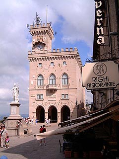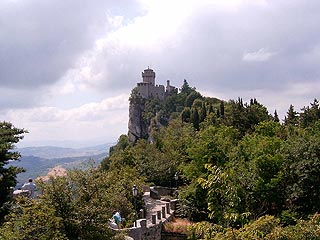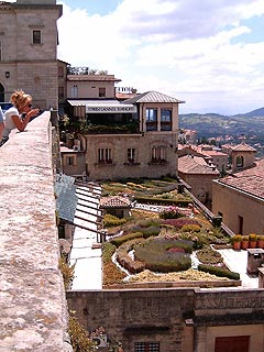 Ma megint élmény-nap van és még buszozni se kell sokat: csak felugrunk ide a hegyre, a Monte Titano-ra, hiszen tudjátok. Ott alapított köztársaságot a császár által üldözött keresztényekből egy bizonyos Marino nevű kővágó. A köztársaságocska aztán létének 16 évszázada alatt a császárok és a pápák erőterében ügyesen lavírozva a túlerőnek keményen, a cselvetéseknek ügyesen ellenállva fennmaradt a mai napig. Húszezernyi lakosa már nemigen az ősök szabadságszeretetére büszke, inkább a ma virágzó kereskedelmére és idegenforgalmára. A mini-állam területe 60 km2, amely a Titán-hegy csúcsát és lejtőit jelenti. A csúcson a „főváros”, San Marino fogadja a vendégeket. A legbelső városfalon kívül lehet csak parkolni, mert belül járművel mozogni a meredek és keskeny utcácskák és a lépcsők miatt gyakorlatilag lehetetlen . A buszunk itt marad és mi szájtátva tódulunk a kő mellvédhez, ahonnan pazar kilátás nyílik. Hozzánk közel a városállamhoz tartozó pár apró, de csinos település szinte térképszerűen terül elénk – alánk, messzebb az Appenninek hegylánca ad csipkézett kontúrt a látóhatárnak. A parkoló fölé a belső városfal magasodik, de minthogy békés szándékkal és tele pénztárcával közelítünk, nincs szükség ostromlétrákra, elég a 40-50 lépcsőn felkapaszkodni és már ott is vagyunk a Szt. Ferenc kapunál. De jaj, irgalom anyja ne hagyj el: egy rendőr állja ott el az utat halványkék sapkában, okkersárga ingben és sötétkék nadrágban, szeme harcias pillantását napszemüvege takarja, ingéhez illő színű kesztyűjét lazán markolja, de majd nyilván felhúzza, hogy az ostromlók elleni közelharcban kézét vérükkel be ne szennyezze. Pár helybéli ad kulcsot a helyzethez: lazán folyják körül ki- és bemenet az élő szobrot, ő itt nem őr, hanem díszlet. Nyomulunk előre és a kapun belül egy hamisítatlan középkori utcarészlet közepén találjuk magunkat. Az ódon házak között kanyargó sikátor zászlódíszbe öltözött, az apró, de gonddal díszített udvarocskákra faragott címerű kapukon keresztül lehet becsodálkozni, csak a kövezeten tóduló turisták hada nem illik a korhű miliőhöz. A rövidgatyás, pólós, fényképező, vásárló siserahad uralja a terepet, nyilván ezért nem mutatott a főkapunál a rendőr semmi ellenállást: a város katonailag elesett, ez nyilvánvaló. (Az már más kérdés, hogy kereskedelmileg épphogy most van nyerőben). A fennszülöttek boltjaik elé is pakolva pultjaikkal még tovább szűkítik az amúgy is szűk teret, néhol csak a szégyellt és elátkozott tülekedés segít át a „külkereskedelmi” akadályokon. Van itt minden náció: svédek bámészkodnak csendesen, olaszok perlekednek hangosan, ferdeszeműek fényképeznek ferdeszeműeket ráérősen és magyarok alkusznak rámenősen, kevereg itt német, lengyel, angol és szerb. Az árusok tapintatosan, de határozottan kérdeznek rá rövidtávú beszerzési terveidre, és elvesztél, ha picit is gyengének mutatkozol: azonnal előkerül a magyarul(!) tudó eladó és hamarosan elveszted a józan ítélőképességed a csak neked, csak most és csak itt adható engedmények, árukapcsolások, adómentességek és árleszállítások útvesztőjében. Nem szabadulsz hat butéliás bor-szett, pármai sonka, Totti feliratos mez és szamurájkard nélkül, halmazati büntetésül pedig vagy végigcipeled az egészet ezen a San Marino nevű háromdimenziós labirintuson, vagy visszamész a buszhoz lepakolni és kezdheted elölről a lépcsőzést. Gyakorlott, józsefvárosi piacon edződött egyedként most csak adatbázist képzünk az árakból, boltokból, minőségekből agyilag és majd a visszavonulás szakaszában kerül elő a pénz és az alku. Felérünk a hegy csücskére, ahova a fülkés felvonó hozza – viszi a népet. Itt – ha lehet – még zavartalanabb és csaknem körbefutó a panoráma: egyszerre látni a hegyeket és egy hátraarccal a partot, de a Monte Titano tengerre néző szirtjeit is, amelyeken a város falai, védőbástyái végighúzódnak. Pazar látvány, a helyi kiadvány szerint tiszta időben még a dalmát partokat is látni lehet innen. Megnézzük Zsuzsa vezérletével a Szent Bazilika belsejét, ahol az alapító és később szentté avatott Marino hamvai is nyugszanak. Végigvonulunk a Kormányzói Palota előtti téren, megcsodáljuk a kétfős mini-őrség operettbe illő egyenruháit, az őrségváltás bakafántos koreográfiáját és az államocska legfőbb értékének tartott szabadság allegorikus szobrát. Egyre feljebb és feljebb kapaszkodunk a sétányokon, elvonulunk a várfal három védőbástyája alatt, benézünk az árkokba és ciszternákba, melyek régen az életet adó vizet gyűjtötték a védőknek, teszünk pár lépést a második és a harmadik bástya közötti Boszorkánylépcsőn, de aztán vége: a szépséget, a látványt már nem lehet tovább fokozni, a szépnél már nincs szebb.
