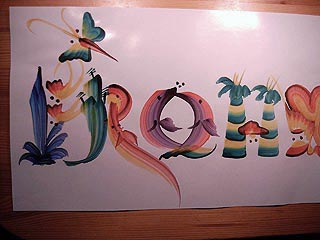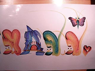Ennyi alvás után kell egy kis mozgás, belehasítunk az éjszakába, elvegyülünk az utcai színes forgatagban. Alig megyünk pár métert, egy utcácska torkolatában embergyűrű vesz körül valakit. Laza belharc árán sikerül közelebb furakodni az asztalkához, ahol egy távol-keleti ül és rajzol. Előtte fényezett papír, kezében centinyi széles, rosthegyű toll, tálkában festékek. Bemártja a toll egyik sarkát a kékbe, a másikat a sárgába és már húzza is a szélén kék és sárga, közbül a zöld minden árnyalatával ékes szalagnyomot. Most elfordítja a tollat, a szalag vonallá szűkül és ívesen elkanyarodva vége szakad, aztán egy félköríves másikat illeszt fölé: jé ez egy R betű lesz! Picit letörli a szerszámot, most másik szín-pár kerül a rost-toll élére és egymásra fekvő körömnyi félkörívekből csíkos pálmatörzset varázsol, a tetején kétfelé hajló levelek formázzák a T betűt. M-et, N-et egy sárkány kígyóteste alakít, testük pikkelyezettségét keze remegtetésével érzékelteti, O betű ívben meghajolt testű halakból lesz. Egy pötty-pár még az állatok szemét is jelzi és a végén díszként pillangók, ékezetként szívecskék ékesítik a rajzolt betűket.