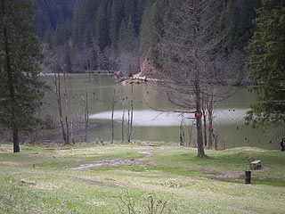 A Gyilkos-tó (románul Lacul Roşu, azaz Vörös tó) a szomszédos Békás szorossal (Cheile Bicazului) együtt Székelyföld egyik legismertebb természeti nevezetessége. Annak ellenére, hogy viszonylag fiatal képződmény, a tóhoz több legenda is fűződik, ami a nevével és a keletkezésének körülményeivel kapcsolatos. Maga a tó 1837-ben (más források az 1838 januári földrengés következményeként tartják számon) keletkezett, amikor egy sziklaomlás következtében elzáródott a Békás-patak. A magyar és a román név azoknak állít emléket, akiket a hagyomány szerint a leomló sziklák maguk alá temettek. A Békás patak hordaléka konzerválta az egykori fákat, amiknek törzse ma is kiáll a tó vizéből. Korondról a Gyilkos-tó vidékére a legrövidebb út Parajdon (Praid) át vezet. Innen indul a 13B jelű út, ami vadregényes, hegyi tájon visz Gyergyószentmiklósig (Gheorgheni). Korábban ennek az útnak a minősége annyira rossz volt, hogy normál személyautóval felelőtlenség lett volna elindulni. Néhány évvel ezelőtt a teljes útszakaszt felújították, ezzel sokaknak lehetővé tették a használatát. Gyergyószentmiklós után ismét hegyek között megyünk, ezúttal a 13C úton, melynek minősége már hagy maga után kívánnivalót. A Gyilkos-tóhoz közeledve egyre több autóval (közöttük teherautóval is) találkozunk mindkét irányban. Ennek oka nemcsak a környék látogatottsága, hanem az is, hogy a Békási szorosból vissza, Erdély felé csak ezen az úton érdemes menni, mert a másik irány a hegyek miatt legalább százkilométeres kerülőt jelent. Igaz, a kerülőt vállalva felkereshetjük a Békási víztározót, Borszéket (Borsec) és Toplicát, másik nevén Maroshévízt (Topliţa). Ezek a városok messzeföldön ismertek fürdőikről és gyógyvizükről. A fentieken kívül az út forgalmát növeli az a tény is, hogy Erdély és Moldva között ez jelenti a legrövidebb összeköttetést. Mi visszafelé nem ezt az utat választottuk, hanem ugyanazt, amin jöttünk. Már csak azért is, mert egy ebéd erejéig meg akartunk állni a Parajd és Gyergyószentmiklós közötti úton a Bucsin tető nevű helyen. Közvetlenül a Gyilkos-tó mellett az ilyen helyeken sajnos az ilyen helyeken már megszokott zsibvásár fogad. Meglehetősen illúziórontó ezen a gyönyörű tájon mindenféle semmire sem használható porfogók tömegét látni a néhány többé, de inkább kevésbé hasznos tárgy mellett. Ez sajnos világjelenség, az üzleti érdekek az esztétikumot a legtöbb turistalátványosságnál háttérbe szorítják.