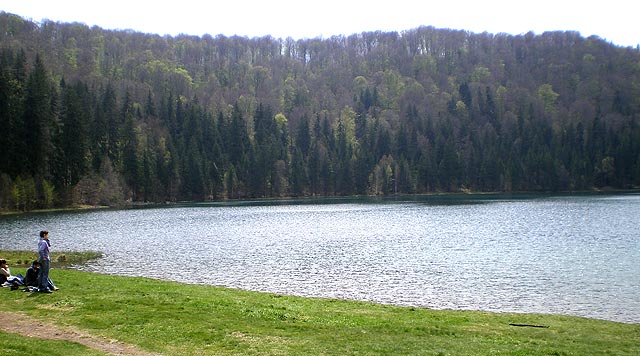 Csíkszereda után a 12-es úton Sepsiszentgyörgy (Sfăntu Gheorghe) irányába fordultunk, és mintegy 40 km. megtétele után Sepsibükszádnál (Bixad) a Lacul Sf. Ana (magyarul Szent Anna tó) táblánál balra vettük az irányt. A néhány évvel ezelőtti későőszi, de már részben havas időben lebonyolított utunkhoz képest jelentős változás volt, hogy most a változatlan minőségű úton viszonylag erős volt a forgalom. A sok személykocsi mellett számos buszt is láttunk mindkét irányban. Közülük jónéhány magyar rendszámú volt. Most szó sem volt arról, hogy csak 1-2 autót látunk, mint ahogy emlékeinkben élt. A parkolójegy 3 RON-ba került, a zsúfolt parkolóban alig találtunk magunknak helyet. A már ismert útvonalon egy húszperces kényelmes sétával leballagtunk a tóhoz. A tóról röviden: a 950 méter magasan levő tó a Nagycsomád (Ciomatul) nevű hegy kialudt kráterében van. Vize kristálytiszta, ezt meg is akarják őrizni, ezért a motorcsónakokat kitiltották róla.