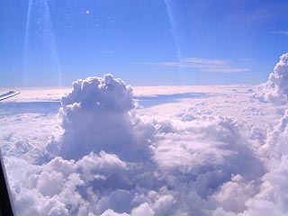 A jelzett beszállító kapunál már vagyunk egy gépnyien, mégsem történik semmi, aztán nagysokára egy egyenruhás egy lépcsőhöz vezet és lebotorkálunk a betonra, ahol egy csuklós buszra szállítanak, aztán újabb tíz perc várakozás helyben és átszállunk egy másik buszra, ami végre a géphez visz. Ott aztán ahány ajtaja csak van a repülőnek, mindegyiken át rohaaam!, elfoglaljuk a helyeket. Szerencsénk van ismét, sikerül Marcsival egy ablak melletti párost megcsípni. Hamarost a levegőben vagyunk, formás, habos felhők közt búcsúzunk a vikingek szépséges hazájától és hálatelt szívvel gondolunk Katira, akinek ezt az élménydús látogatást köszönhetjük.
