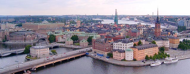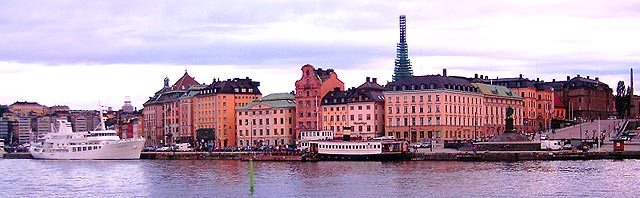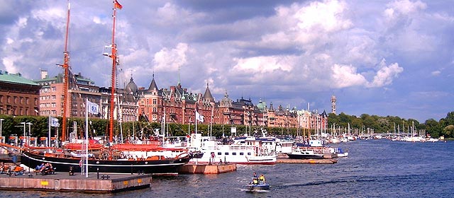 A part felé vesszük utunkat, ami itt nem nehéz dolog. Stockholm t.i. a tenger és a szárazföld átmenetén épült. Képzeljétek el, hogy a tenger felől közelítünk a szárazföld felé. Előbb kis szigetek ritkás garmadája tűnik fel, majd a befelé haladva a szigetek sűrűsödnek, köztük a vízfelület csatornákká keskenyedik, míg végül már a szárazföld kerekedik felül, mert az öleli át a tavakká zsugorodott vizeket. Még jobban megbolondítja a helyzetet, hogy a szárazföld felé tovább haladva a hatalmas Mälaren tó partja következik, amely szintén csatornák és szigetek kusza hálózata. A tó és a tenger vize egyetlen csatornán keresztül van összeköttetésben. Nyilván a hajózás ellenőrzése, mint stratégiai fontosságú előny miatt épült épp ezen a helyen, a nyílt tengertől kb. 30-40 km-nyire Stockholm, észak Velencéje. Itt, a tó édes és a tenger sós vizét elválasztó zsilipnél alakult ki a történelmi városmag, a Gamla Stan. A város többi kerületét is át- meg átszövik a csatornák, öblök. Tehát irány a víz, némi tájékozódás után kiérünk arra a partszakaszra, ahonnan elénk tárul egy szigeten a történelmi belváros. A part, ahonnan nézzük, a pesti Duna-parthoz hasonlóan kiépített: a vízre néző házsor előtti macskakővel kirakott, széles területet hatalmas, faragott kövekből épített partfal szegélyezi, rajtuk a hajdan kikötéshez használt, megfeketedett vasoszlopok. Jelenleg parkolásra használják, hajók itt már nem kötnek ki.
