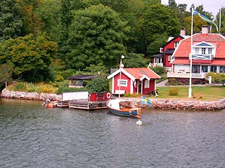 Elmarad a város, szélesednek a csatornák, a parton víz és jég koptatta sziklák, kövek, fenyők, nyírfák: az egész kísértetiesen hasonlít a kanadai Nagy-tavak jégkorszak tarolta partjaira. Az ős-masszívum gránitja alkotja ezt is, azt is, még a színük is hasonló . Nyaralók, parányi kikötők néznek a vízre, szinte mindegyiknél fenn a nemzeti kék-sárga zászló: vannak a háznál. (Nálunk ezt biztonsági okokból nemigen mernék a nagyvilág tudtára hozni, mert ha nincs fenn a zászló, könnyen hivatlan látogatók érkeznének.) Az épületek hagyományosan fából készülnek és vörös színűek, az ablakok, ajtók keretét, és a tetőszegélyt fehérrel emelik ki. A vöröst a fa a réz ércelőkészítésének egy melléktermékétől kapja, ami állítólag akár 200 évig is képes az épületfát konzerválni. Megcsodálom, ahogy a hajónk beáll a pár méter szélesen kiépített parthoz: orral közelít lassan és mikor elérte, a hajócsavart lassan járatva "tolja" a partot, amíg ki- és beszállnak.. Kötélnek, kikötői oszlopnak, egyáltalán kikötésnek nyoma sincs. Induláskor aztán rükvercbe kapcsol, kitolat és egy laza fordulóval már folytatja is útját. A kapitány a szűk csatornákon egyébként is zsonglőrködik a méretes vizijárművel, a vízsugár hajtóművekkel szinte helyben képes megfordulni. Elérjük Vaxholm-ot, ahol egy lőrésekkel bőven kicifrázott erőd vigyázta Stockholm tengeri bejáratát évszázadokon át. Fokozatosan szélesednek a vizek, bár a szigetek is nagyok és lassan elérünk Möja-ba, a prospektus szerint festői szépségű halászfaluba. Kiszállunk, annyi időnk marad, míg a hajójárat a következő faluból megfordul.