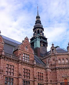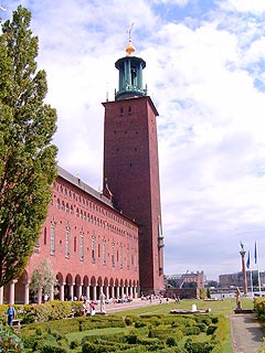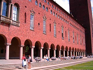 A Városháza (Stadhuset) nincs messze a Központi Pályaudvartól, gyalog 10 perc, csak át kell menni egy hídon, mert - nem mondtam még? - a Városháza is egy szigeten van. Az épület vörös téglából épült, négyzet alapú tömbje egy tágas udvart ölel körül, tornya a négyzet egyik sarkához illesztve magasodik. Beérünk a kövezett udvarra, ahol már rengeteg ember vár bebocsátásra. Mi egy német csoporttal fogjuk végigjárni a termeket, ezért egy kék öntapadós pöttyöt kapunk a ruhánkra, hogy a csoportszellem erősödjék.