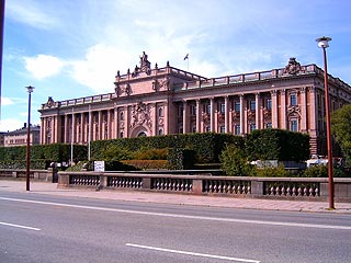 Kék az ég, szépen süt a nap, Kati szerint 25 C, azaz skandináv kánikula várható mára. Beperemvasutazunk a T-Centralen-ig, onnan pár T-Bana megálló az Óváros és már ott is állunk a szigeten. (Na ezzel nem nagyon szűkítettem le a helyszínt, a sziget itt annyi, mint Pesten a villanyrendőr.) Mint a gyerek a cukrászdában, szaladnék egyszerre sokfelé: szemben velünk a Riddarhuset (Lovagok Háza) klasszikusan szép épülete, előtte Vasa Gusztáv bronzszobra, melyet a narvai csatában az oroszoktól zsákmányolt ágyúkból öntöttek. (Nem tudom, lett volna-e más európai ország, ahol beolvasztás helyett ne fordították volna azonnal szembe azokat az ágyúkat az ellenséggel. Talán ez is a titka a svédek békességes lelkületének). Balra a Riddarholmen szigetre vezet át híd és közelebbről is megcsodálhatjuk a Riddarholmskyrkan (Lovagok temploma) mesteri alakú, öntöttvasból készített, áttört csipkés tornyát. A templom őrzi a svéd történelem nagyjainak sírhelyét. A belépő zavarában azt sem tudja hova lépjen: a főhajó padozatát a szorosan egymás mellett sorakozó királysírok díszesen faragott fedőlapjai képezik, azon jár a jónép. Nagy lehet az érdeklődés, a márvány fedőlapok feliratait, faragott díszeit a talpak csaknem símára koptatták. Csodálom, hogy akár kegyeleti, akár műemlékvédelmi okokból eltűrik a sírokon járkálást: a német már régen szerkesztett volna fölé egy vastag üvegpadlót. A falakat a főnemesi családok, köztük a Vasa, a Bernadotte és a Karolin nemzetségek zászlói és címerpajzsai díszítik. Hagyományosan itt adományozzák Svédország legelőkelőbb lovagrendjének, a Serafimer Lovagrendenek a rendjelét. XIV Károly Gusztáv király többek között Joszip Broz Tito-t, a láncos kutyát, később Nicolae Caucescu-t, a véreskezű román diktátort tüntette ki ezzel a rendjellel bizonyítva, hogy a királyok sem tévedhetetlenek, szegény ősök meg foroghattak a kőlapok alatt rendesen. A lovagok miniszigetéről visszatérünk az Óváros történelmet lehelő házai, szűk utcái közé. Amúgy óvárosiasan rengeteg az aprócska bolt, régiségekkel, antikvitásokkal teli kirakat, de persze illatszer, divatholmi is akad bőven. A lányok csemegéznek, csellengenek, bennem meg gyorsan megérlelődik a döntés: itthagyom őket, hadd örüljön ki-ki a maga kedvtelésének. Délben van a királyi gárda őrségváltása, előtte találkozunk. Az utca ahol állok, a sziget partvonalát követi két házsorral beljebb. Az utca keskeny, gránitkockákkal kirakott, akárcsak az egész Óváros. Itt nem öntik ki a kockakövek közét szurokkal, mint nálunk: a homokágyba szorosan rakott kövek mégis szilárdan állnak, az egyetlen ellensége az ilyen rakott burkolatnak a folyó víz, amely kimosná a homokot. A házak 2-3 emeletesek, keskeny homlokzatúak, színesek, némelyikük a germán városok házaihoz hasonlóan favázas, téglával kirakott közökkel. Kiérek a házak közül, előbb a Minisztérumok, majd - természetesen egy másik szigeten - az Országház épülete magasodik elém, amely stílusában a mi budai Várunkhoz hasonlítható leginkább: az ablakokat díszesen mintázott kő-girlandok hangsúlyozzák, köztük klasszikus metszésű oszlopok törik meg a homlokzat egyhangúságát . Büszkeséggel állapítom meg mégis, hogy az egész épületegyüttes a mi Parlamentünknek sem méretben, sem szépségben a kisöccse sem lehetne. A szomszéd épület igazán grandózus méreteivel kap meg: ez a Királyi Palota. A partmenti utat kovácsoltvas kerítés választja el a Palota kertjétől, ami helyhiány miatt nem túl széles. A kerítés közepén hatalmas, díszes kovácsoltvas kapu, mellette sárga őrbódé kék tetővel, előtte egy szép szál ifjonc, aranysujtásos, kék uniformisban. A kapun hatalmas korona, és tömören csak annyi: XVI. (t.i. tizenhatodik Gusztáv). Az hogy a király Gusztáv, az Svédországban nem kérdés, azt ki sem írják, néha az egyhangúság megtörése végett esetleg Gusztáv Adolf, vagy Vasa Gusztáv, de semmi több. Végigbattyogok a kerítés előtt az Óváros hajdani rakpartján, a Skeppsbron-on és a Palota sarkánál befordulva már az enyhén emelkedő Várdomb tárul elém, végén a Székesegyházzal. Erre a térre néz a Palota hosszabbik oldala, középen a főbejárat. Ez a szárny a