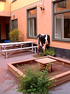 Odébb, az utca háromszögletű kiöblösödésében, komoly talapzaton a svéd Szt. György épp öli lándzsával a svéd sárkányt bronzba öntve már vagy 200 éve, ami a küzdő felek patináján is meglátszik. Egy homeless forma muki akkurátusan végigjárja a szemeteseket és sörösdobozokat gyűjt, egy nő kezében svéd zászlócskával, rakott szoknyában, tornacipőben, fején kuglófsütő formával bámészkodik, ferdeszemű vendégek mosolyognak ferdeszemű vendégek kamerájába, és van egy magyar is, akinek lassan sietnie kellene, mert lekési a randiját. Kilépek, de pár lépésre onnan földbe gyökerezik a lábam . Az emeletes ház szobányi udvarán egy tehén áll, pontosabban egy fél tehén, az elülső fele a falban. Találgatom, mi történhetett: egy hindu tartott itt nosztalgiából szent tehenet, és mert a ház építésekor sem merte odébb tessékelni, szegényke beépült, mint Ságvári Endre az ellenállási mozgalomba. Vagy egy furmányos örmény kereskedő akarta háza belső tejellátását állandóra megoldani, ügyelve, hogy a haszontalan outputok falon kívülre kerüljenek, de az osztósíkot valahogy elszámíthatta és a tőgye is kívülre került (a szobára néző input kellemetlen mellékhatásai és ellenjavallatai tekintetében meg kérdezzük meg a háziakat). Egy biztos, a szobor a víz alatti száműzetését töltő Leninnel(?) együtt jókedvre derített és a western hangulatú Park City (UT) rózsaszín-fehér kockásra pingált, napszemüveges, fülvédős jávorszarvasai jutottak eszembe. Azt hiszem, kellenek az ilyan lüke szobrok egy ódon hangulatú városrészbe, hogy annak komolyságát oldják. Hogy a mi Várnegyedünkbe egy lila-borsózöld pöttyös szürkemarha vagy egy nemzetiszín csíkos pulikutya lenne-e jobb erre a célra, azt a fantáziátokra bízom.