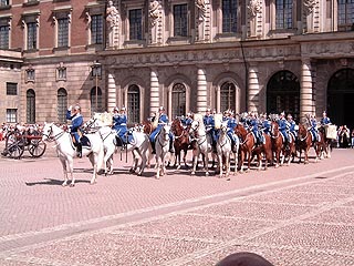 Jól eldumáltam megint az időt, a Királyi Palotának a sziget belseje felé néző oldala és két íves szárnya által közrezárt jókora területeten már gyülekezik az őrségváltásra kíváncsi nép. A félkör alakú tér egyik felén délceg kiskatonák állnak a már jólismert kék-sárga egyenruhában, fényesre suvickolt csizmában, tükrösen csillogó sisakban, előttük pár bronzból öntött ágyú célozza a kordon mögött gyülekező tömeget, remélhetőleg csak játszásiból. Még csak háromnegyed dél, de a nézőtér megtelt, akinek az első pár sorban nem jutott hely, az épület oszlopainak talapzatára kapaszkodik fel, nyakát nyújtogatja vagy megpróbál áttörni kevésbé telített szektorokba. Nyílik az őrszoba ajtaja, egy jobb sorsra érdemes díszegyenruhás lép ki és egy gumirádlis kézikocsit húz át a színen (nálunk biztos jutna neki valami heccelődő megjegyzés, pl. hogy most tedd kettesbe, esetleg némi gúnyos taps; itt csend, amerre ment) A rendet fenntartó kiskatonák előbb kicsit robotosra sikerült kézmozdulatokkal, később angol szóval próbálják az ezerfejű szörnyeteget irányítgatni . Végre megkondul a Székesegyház harangja és messziről trombitaszó, patacsattogás közeledik, a tömeg némi unszolásra szétnyílik és szép rendben bemasírozik a váltás. Halk, nyugodt parancsszavakra az új őrség leszáll a lóról, átveszi a nemzeti zászlót és a szolgálatot leadó csapat pihenni vonul. Az igazi show most kezdődik csak: a fúvós és ütős szekciókból álló lovasbandérium veszi át a terepet (a vonós szekció ellen gondolom a vonókhoz kitépett lószőrök fájdalmas emléke miatt a lovak szakszervezete tiltakozhatott).Csoda, amit ezek a zenészek a lovakkal csinálnak: egyik kézzel a hangszeren játszanak, a másikban a gyeplő és a telivér paripák hibátlanul masírozva, szabályos rendben formálják a karusszelt, a legyezőt és más mutatós alakzatokat. Csak a két dobos lova más, afféle nehézkes járású jószágok (mi muraközinek mondanánk), őket gazdáik alighanem combjuk nyomásával irányíthatják, hiszen mindkét kézzel dobolnak. Már rég süketek lehetnek az árvák szerintem, rezzenéstelenül tűrik a fülüktől fél méterre dübögő taktust.