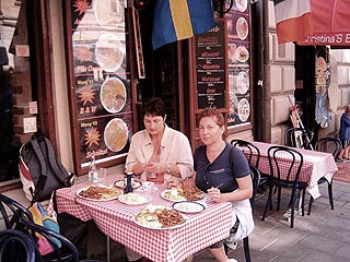 Már odabenn is kongatnak, kiülünk hát egy kisvendéglő teraszára. Odapenderedik hamar a pincér és kisvártatva hozza is a kellemesen pikáns kebab-ot és miközben nekilátunk, a szomszéd vendéglőbe középkori ruhákban zenészek érkeznek, olasz dallamokat énekelnek gitár kísérettel. Mint a dacos gyerek, huzatom magam, nem akaródzik nekiindulni a Skanzen felé: tetszik nagyon a zenei intermezzo.
